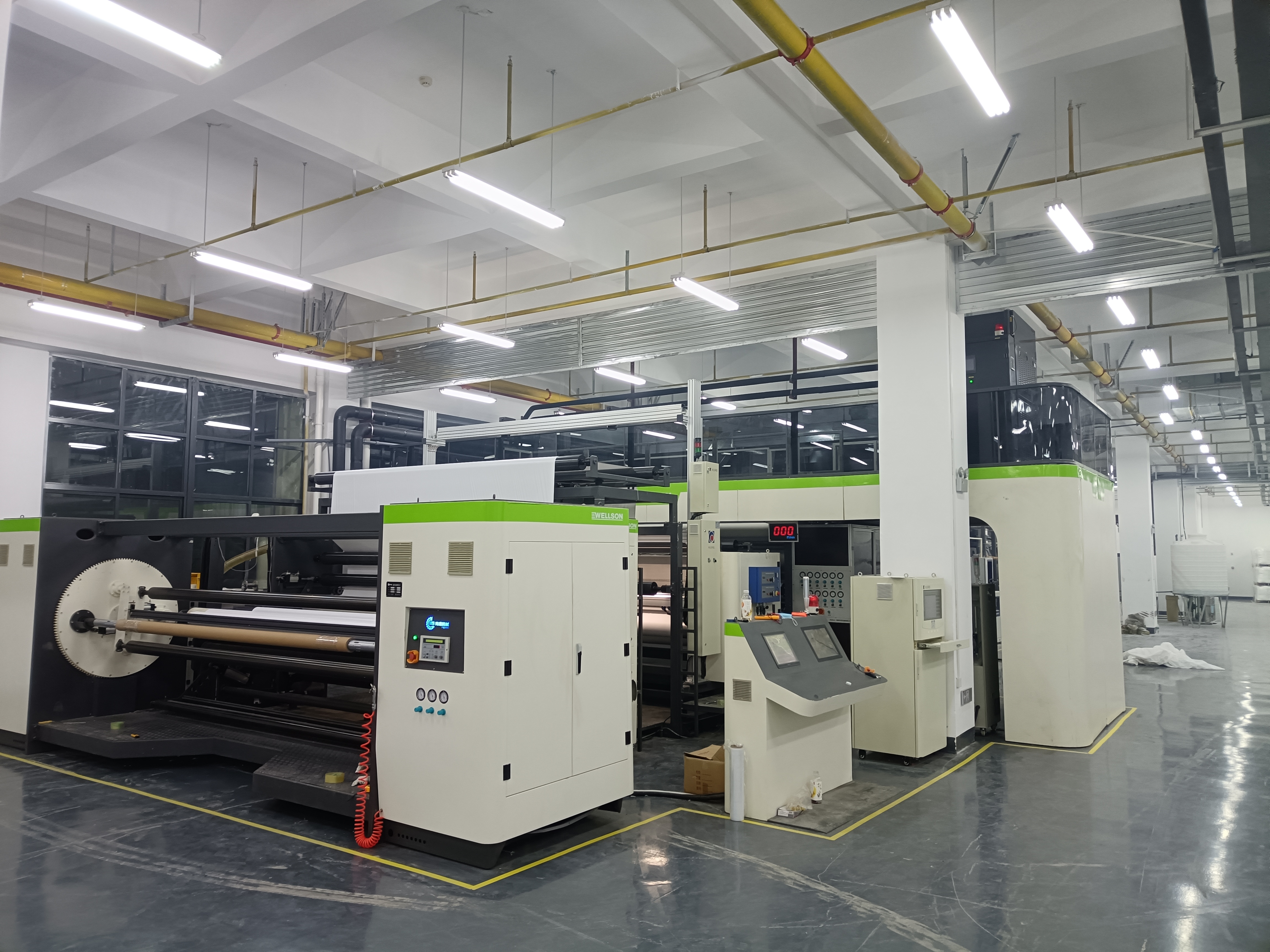 該設備的擠出機具備獨特的混煉效果,確保聚乙烯透氣粒子均勻分散,提高了產品的整體質量和生產效率。此外,配備在線測厚儀和視覺瑕疵檢測系統,可以實時監控膜的厚度和缺陷,有效降低不合格品率,提升產品一致性。整個生產過程由PLC程序智能控制,并通過中央觸摸屏實現全自動化操作,極大地減少了人工干預,提高了生產效率。